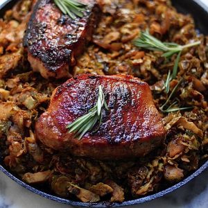 Brown Sugar Rosemary Porks Chops are served with a Caramelized Brussels Spouts, Onion, and Apple Slaw… this is the perfect fall dinner! And can easily be double or tripled as needed.