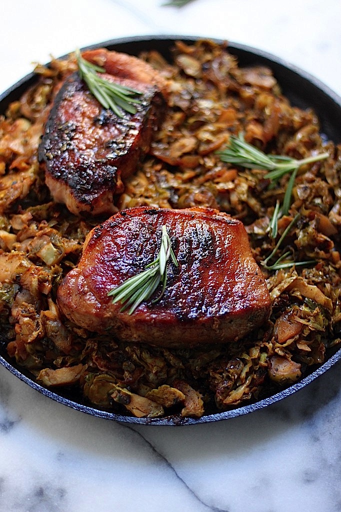 The brussels, onions, and apples are slowly cooked in some olive oil for about 15 minutes (this is where they melt into their true potential) before getting hit with a punch of brown sugar, apple cider vinegar, and a few spices. The slaw cooks a few more minutes on verrrrrrry low, and then, boom – it’s ready! I usually use those last few minutes to cook my pork chops, which, depending on thickness usually takes between 4 (for really thin ones) and 10 (for really thick ones) minutes. This guide is great if you’re new to cooking pork.
