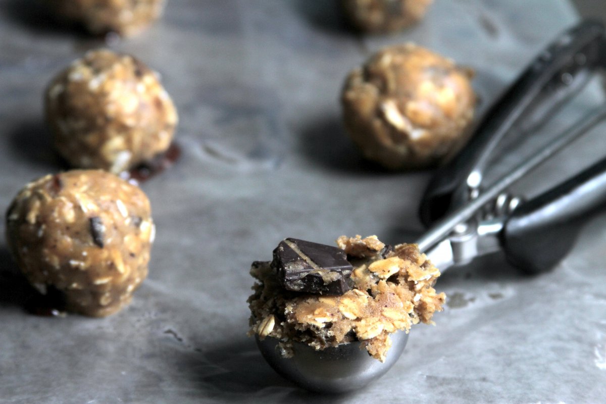 When you’re ready to bake your cookies, preheat your oven to 350 degrees (F). Roll dough into 2 inch balls and place on a baking sheet, making sure each cookie is at least 2 inches apart from the next. Bake for about 12 minutes, or until the edges are golden and the tops look only slightly wet. Remove from oven and transfer to a cooking rack before serving.