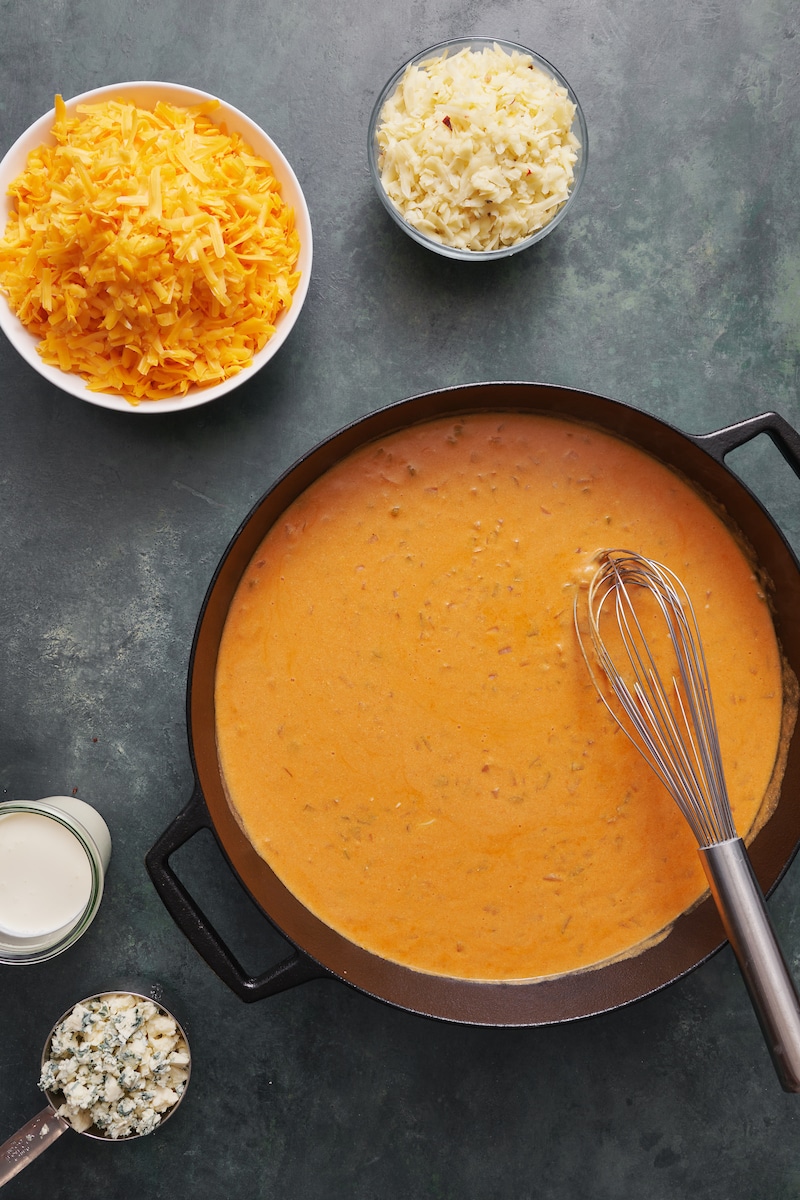 - Reduce the heat to low and slowly whisk in the heavy cream. Then stir in the cheddar cheese, pepper jack, cream cheese, and half of the blue cheese.
