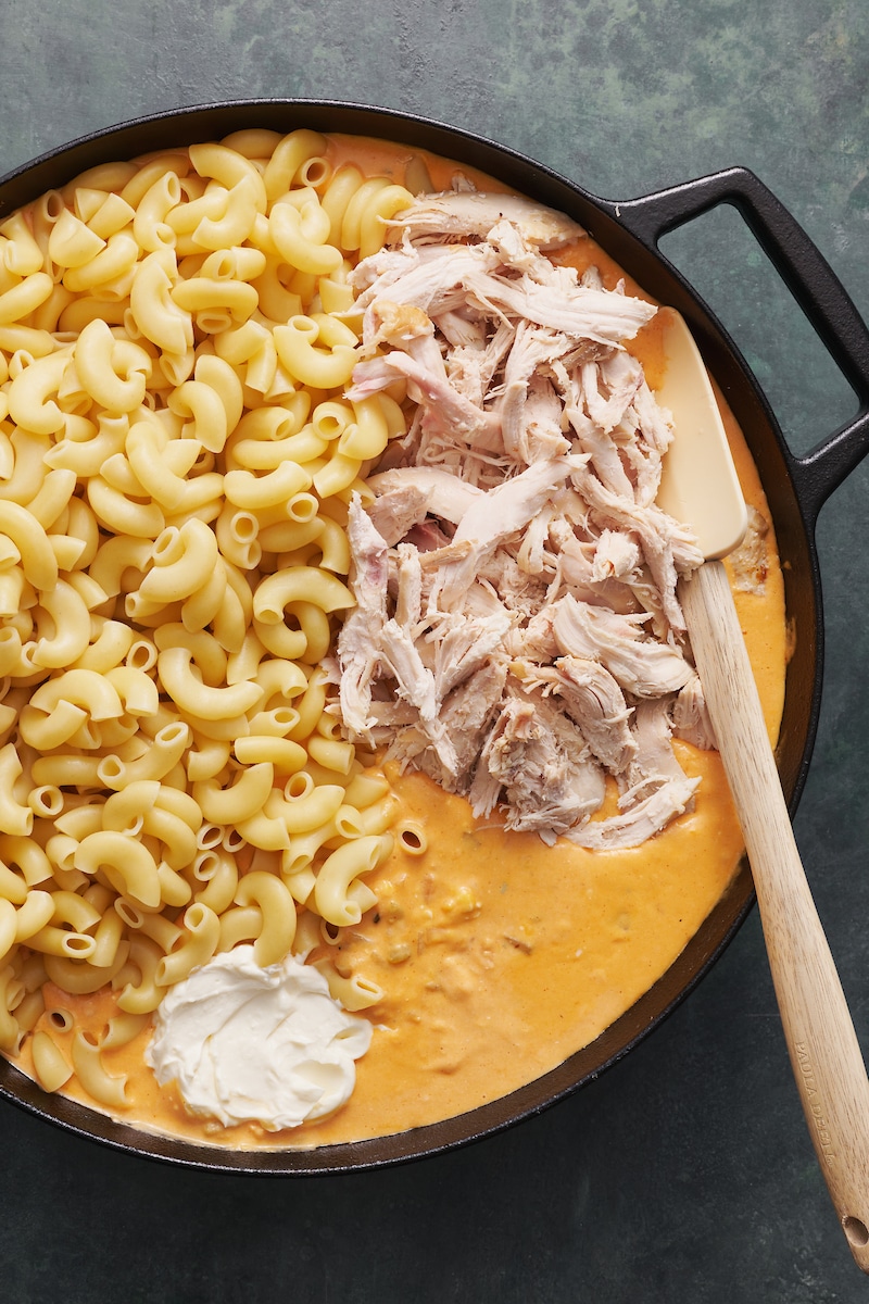 - Fold in the pasta and 2 cups of the shredded chicken and mix well. Cook for 2 more minutes, then remove from heat, top with remaining chicken, blue cheese, and bacon. Sprinkle with scallions and serve warm.