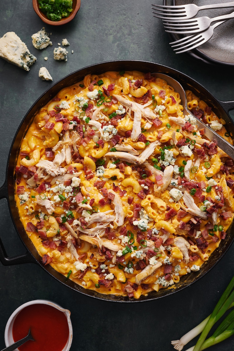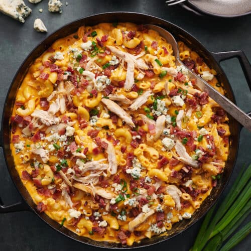 Loaded with shredded rotisserie chicken, buffalo sauce, bacon, and the most delicious cheese sauce, this is the ultimate buffalo chicken mac and cheese recipe! Serve with plenty of napkins and extra hot sauce!