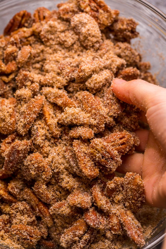 - Egg white is the binder that helps the cinnamon sugar stick to the nuts.
