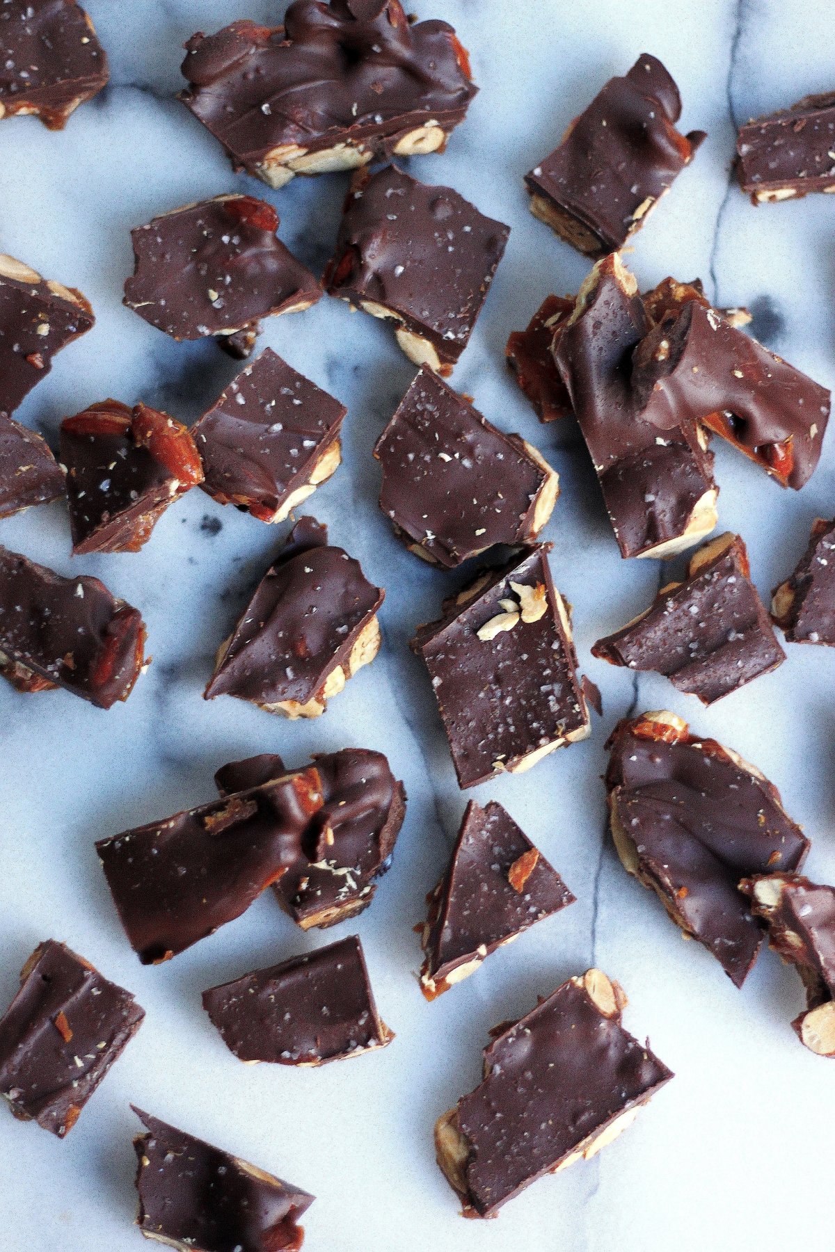 Pour chocolate over cooled nuts, spreading it evenly and smoothing the top as much as possible. Sprinkle with sea salt, then transfer to the refrigerator to cool for at least 30 minutes.