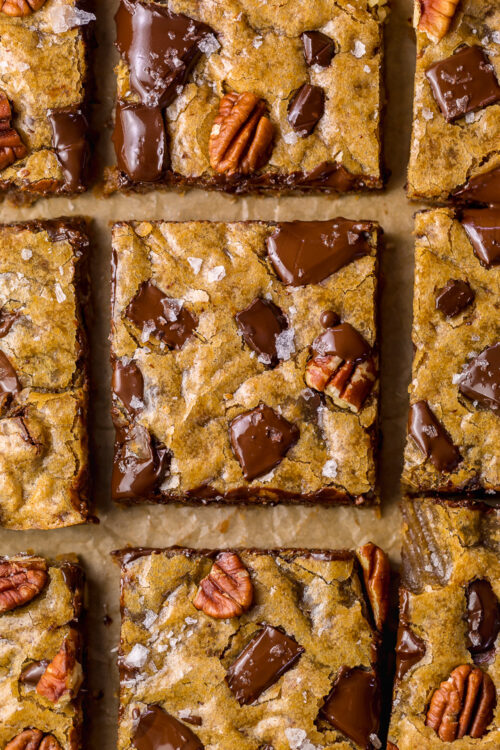 - Frost cooled bars by simply scooping the frosting onto the blondies and smoothing it evenly across the top. Sprinkle with pecans. Cut into small squares and serve!
