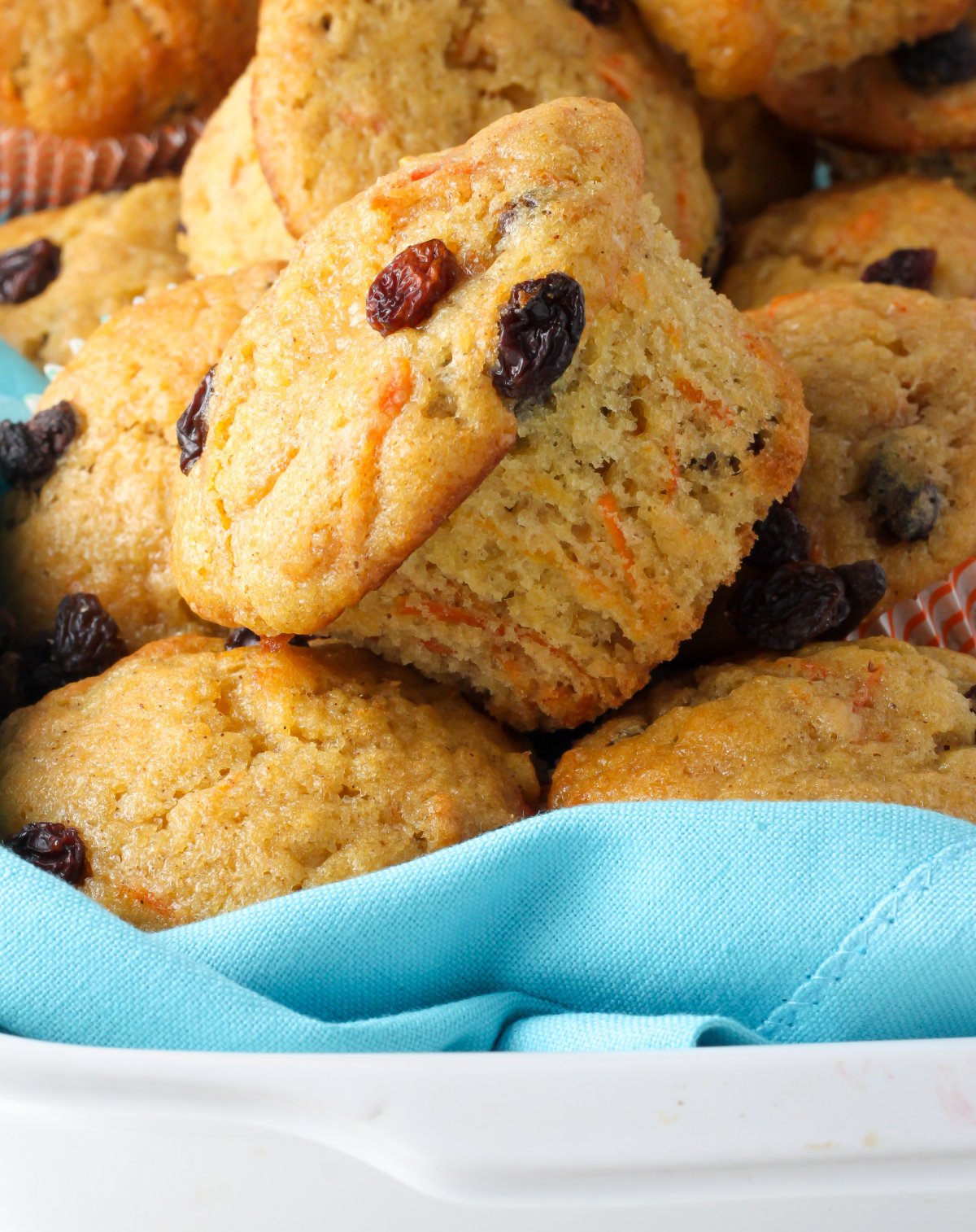 Soft and fluffy, these simple muffins taste like moist carrot cake spiked with juicy raisins and a pop of cinnamon… perfect for breakfast!