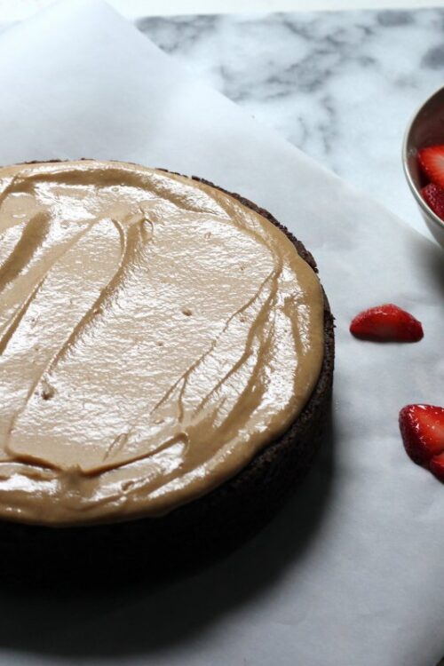 Dark Chocolate Cake with Peanut Butter Mousse and Macerated Strawberries