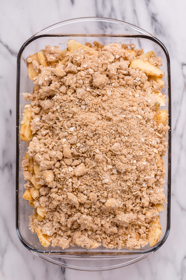 - Pour the apple mixture into a 9×13-inch baking dish and set aside while you make the crumble topping.
