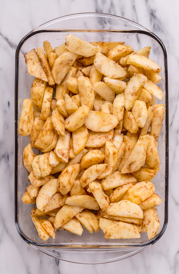- Lemon juice: Just a squeeze keeps the apples from turning brown, and helps the spices coat the apples more evenly.