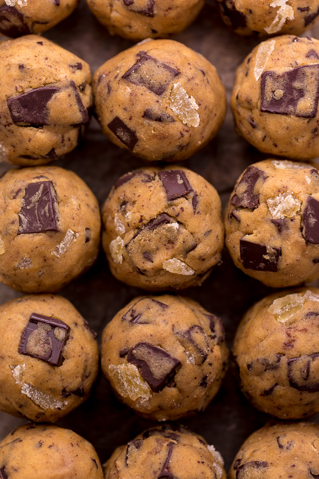 Want your cookies to look exactly like mine?! Simply press a few chocolate chunks and a little candied ginger on top of each cookie right after they come out of the oven. You can also sprinkle them with some flaky sea salt! I love Maldon sea salt because it’s delicate, flaky, and oh so delish.