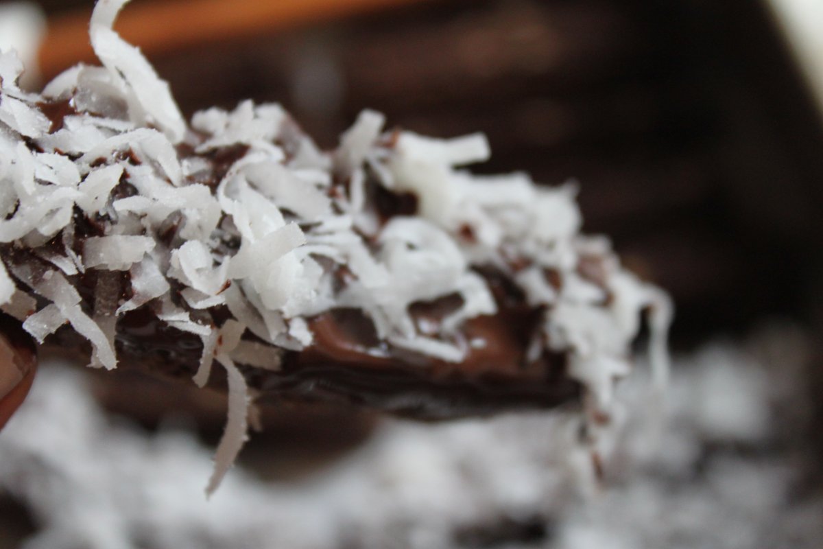 Dip a cut side of each cooled biscotti into the melted chocolate and then in the coconut. Place it chocolate side up on a rack or back on the baking sheet. Continue to dip all the biscotti.