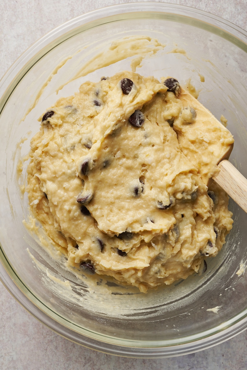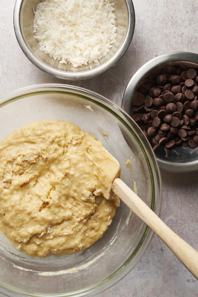 - Fold in the coconut and chocolate chips, mixing just until combined.