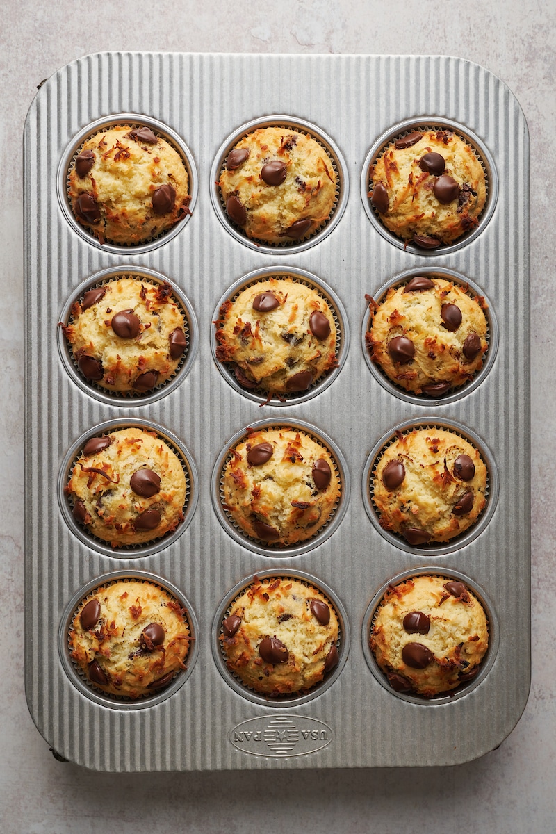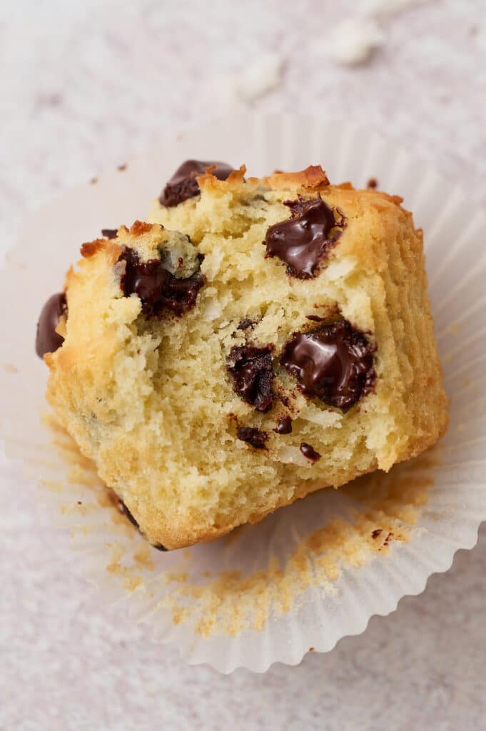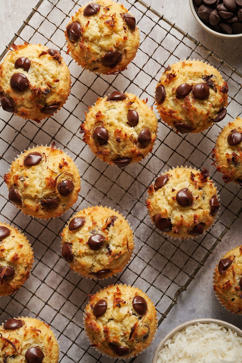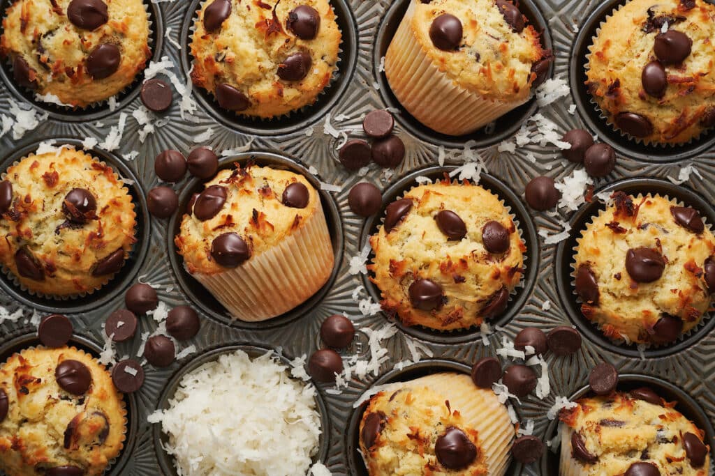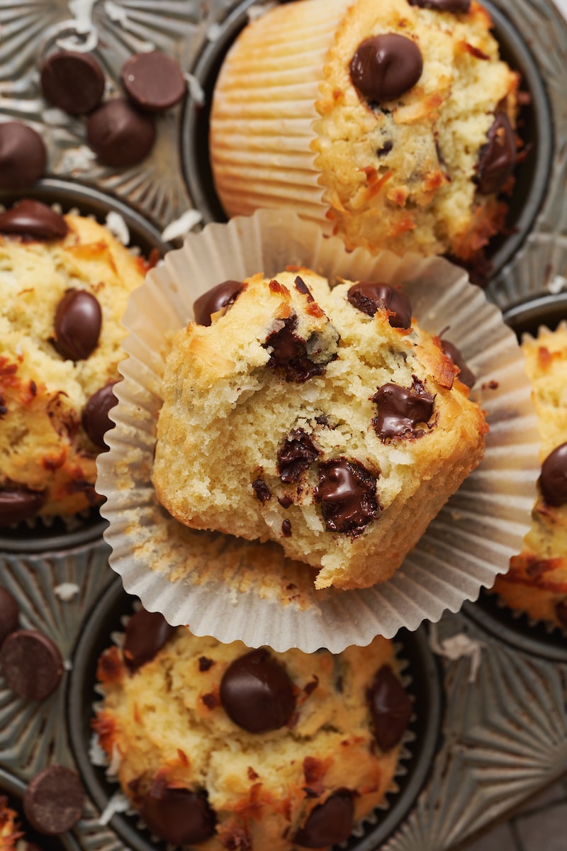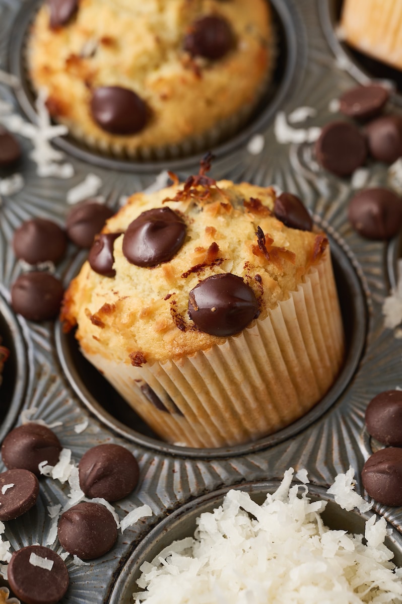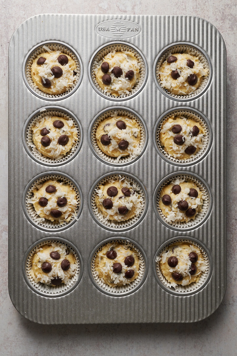 - Divide the batter evenly among the prepared paper liners, filling them all the way up to the top. Sprinkle the top of each muffin with some sweetened flaked coconut and chocolate chips (press them slightly into the batter).