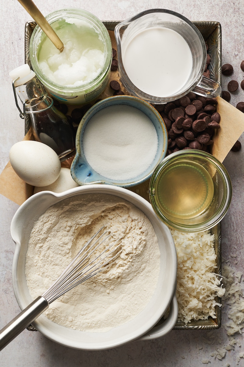 - Baking Powder: Yes, 1 tablespoon of baking powder! The coconut, chocolate chips, flour, baking powder, and salt are your dry ingredients. Make sure your baking powder is fresh (active) and don’t sub it for baking soda.