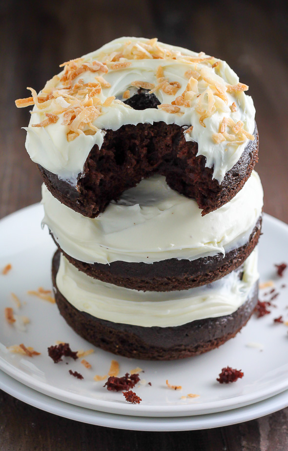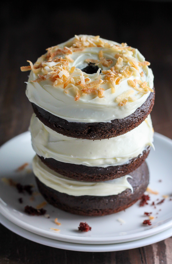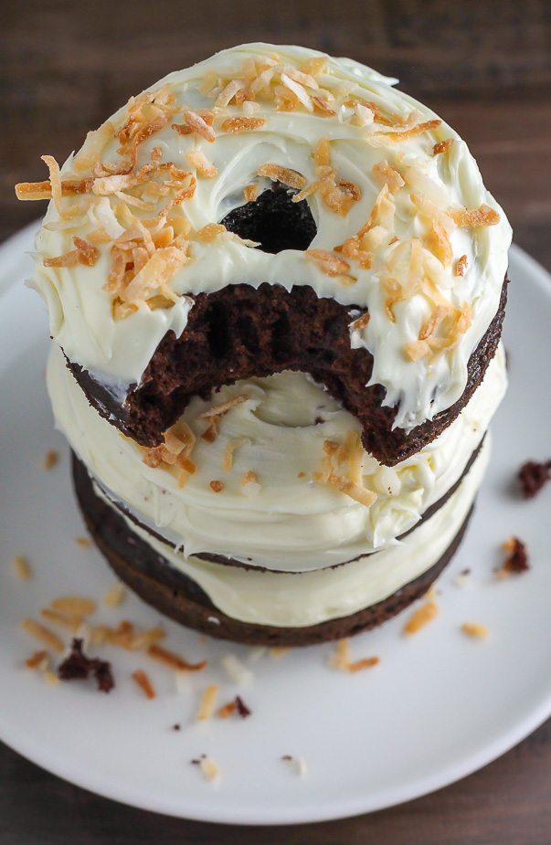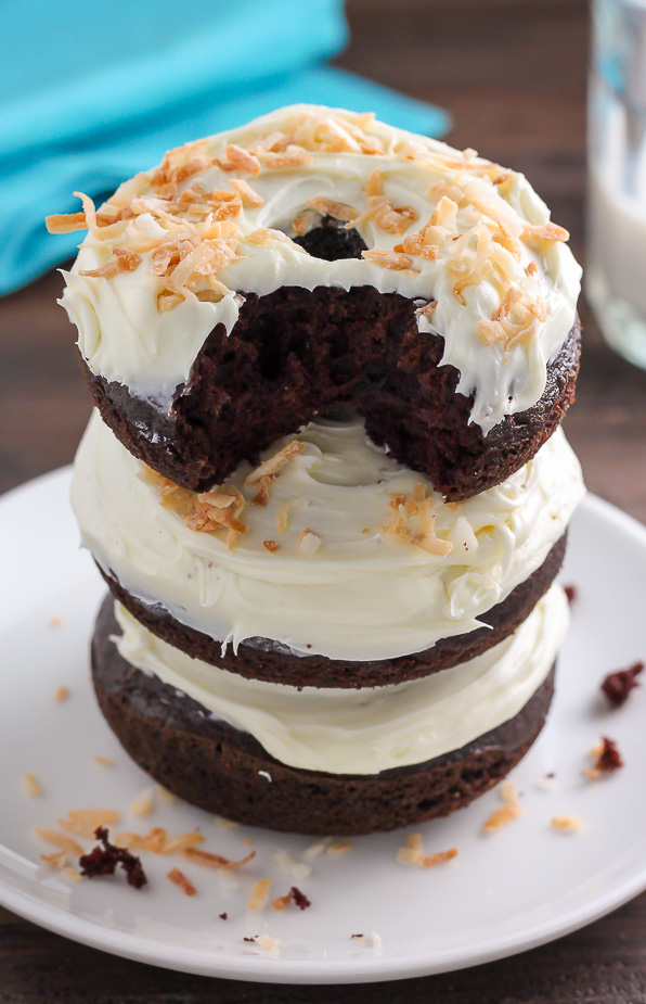 Would you take a look at these beauties? Decadently rich chocolate cake donuts topped with a swirl of coconut cream cheese frosting and a delicate pop of toasted coconut flakes. This s-u-p-e-r easy 20-minute recipe is a hurried bakers DREAM come true.