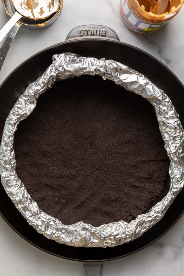 You’ll partially bake this crust then set aside to cool as you make your peanut butter cheesecake batter! P.S. You can totally use graham crackers and make your favorite graham cracker crust for this recipe instead.