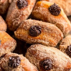 But I digress! Back to the doughnuts. This is a yeasted doughnut recipe, which means they’re ultra fluffy and almost pillowy on the inside, and nice and crunchy on the outside. A quick coat in cinnamon sugar makes them extra special! And the filling, which is in my opinion the best part, is rich and creamy, with a subtle crunch from the roasted hazelnuts. It’s made with just 4 simple ingredients: heavy cream, butter, salt, and chocolate. And by chocolate, I mean the EXCELLENCE Roasted Hazelnut Bars, of course! You’ll need 14 ounces, which equals 4 bars. If you want to amp the flavor up, add a tablespoon of hazelnut liqueur to the filling. Sinfully good!