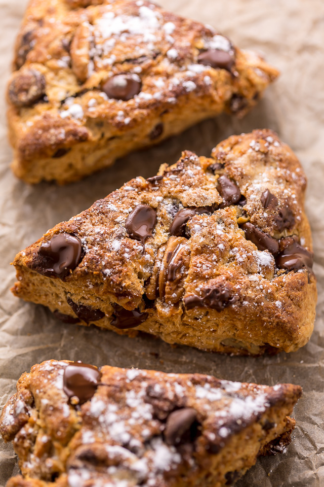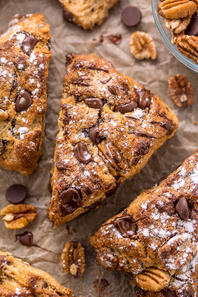 Golden brown chocolate chip scones are flaky, buttery, and packed with plenty of gooey chocolate and crunchy pecans! Make sure to use cold butter so that the scones have a flaky texture. A great chocolate scone recipe for breakfast or brunch!