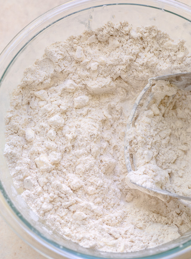 - Add the Cold Butter: Add the cold butter to the dry ingredients use a pastry cutter to work the butter into the dough. Stop when the flour mixture resembles a coarse meal. You wants the chunks of cold butter to be about the size of peas.