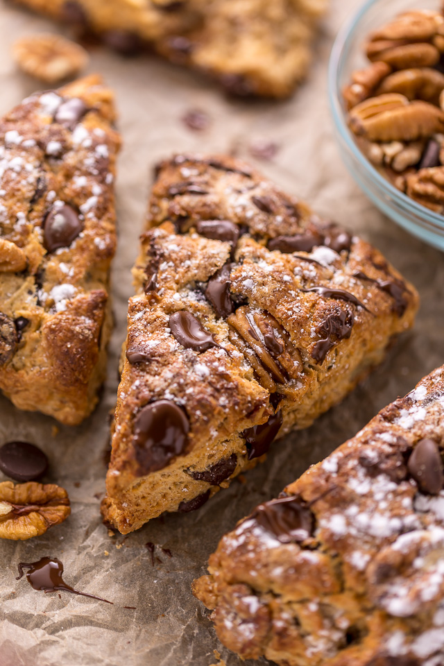 A few months ago I popped into a coffee shop and spotted the tastiest looking chocolate chip scones in the display window! They were deeply golden brown and loaded with GIANT pecan pieces and lots of gooey chocolate chips.