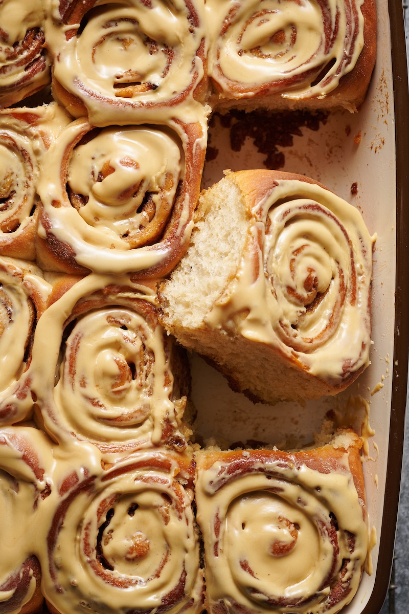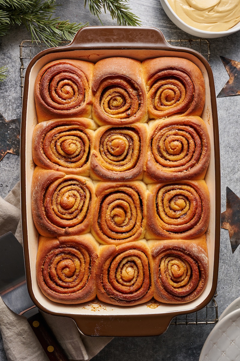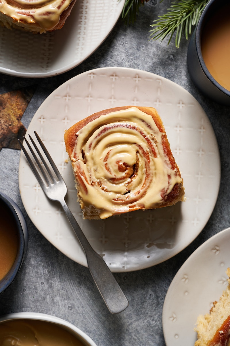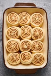 You can save time by making most of this recipe in advance: roll the dough, cut into 12 rolls, pop them into 1 9 x 13 baking dish, and pop in the fridge overnight. Then wake and bake!