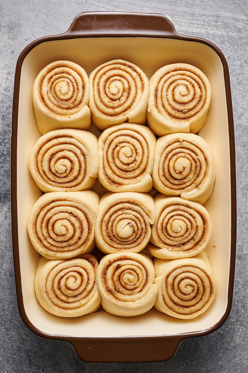 - Carefully arrange the rolls in the prepared pan, making four rows of three cinnamon rolls. Tightly cover the pan with plastic wrap and set aside to rise for about 1 hour, or until the rolls have puffed up and are crowding the pan.
