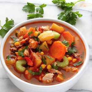 This Chunky Manhattan Clam Chowder is loaded with fresh veggies, bacon, corn, and plenty of clams! Unlike New England Clam Chowder which is cream based, this soup is tomato based and not creamy! Everyone loves this soup recipe!