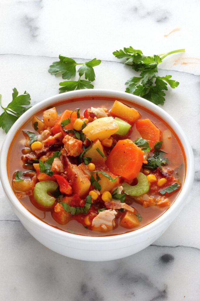 This is not your ordinary ho-hum pot of clam chowder. That I promise you! It may also not be quite what you envision when you think of clam chowder. Many of my friends are only familiar with the creamier version of this soup, known as New England Clam Chowder. This version is not creamy at all – but features a rich, flavorful tomato base that’s loaded with good for you ingredients like potatoes, carrots, celery, corn, and of course, CLAMS! I used canned clams here because they’re quite affordable and easy to locate where I live, but fresh clams may absolutely be used if you’re up for it! Just remember – if you’re going to use fresh clams, be sure you scrub the HECK out of them. Fresh clams carry a ton of dirt and sand, and the last thing you want to taste when you’re taking that first slurp of soup is gritty who-knows-what!
