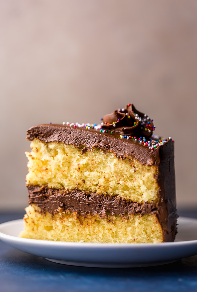 This is the kind of recipe you want in your back pocket for birthday parties, Summer picnics, and everyday celebrations. The cake itself is supremely moist, but to me the flavor is the star of the show. It’s perfectly sweet and buttery, with subtle hints of vanilla. And the creamy chocolate frosting only sweetens the situation. Because I’m a sucker for nostalgia, I love decorating this cake with colorful sprinkles. But fresh raspberries make an equalLY stunning garnish. So you definitely have options as far as decorating goes!
