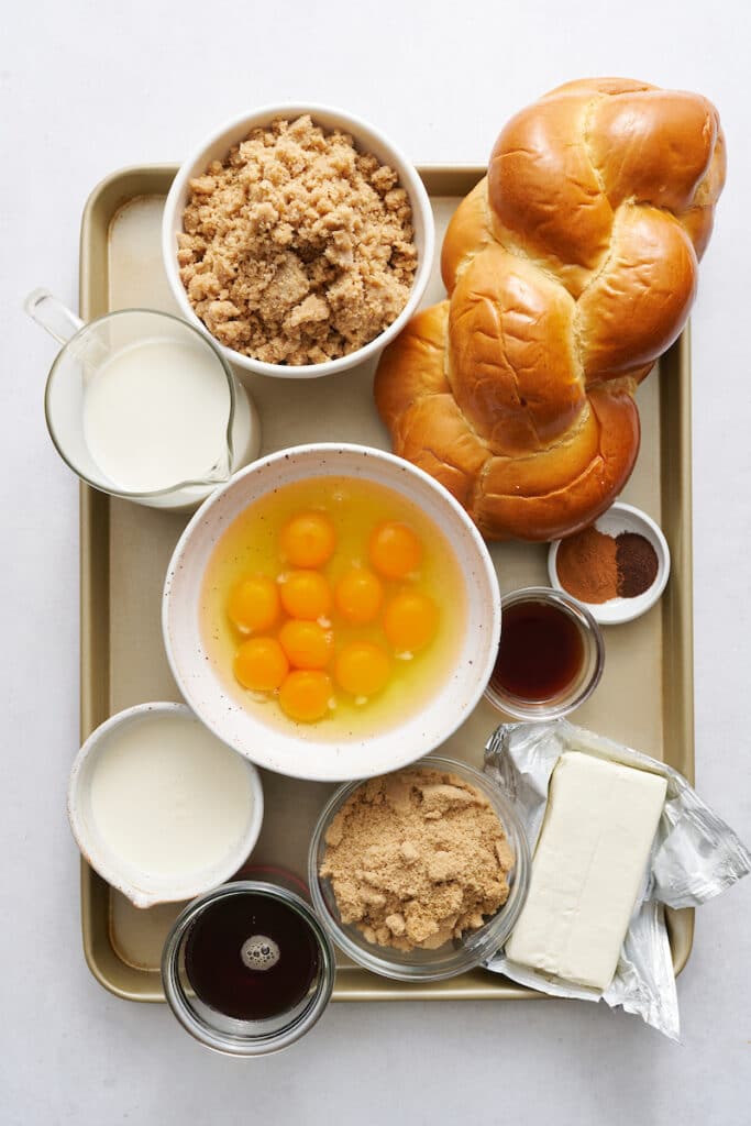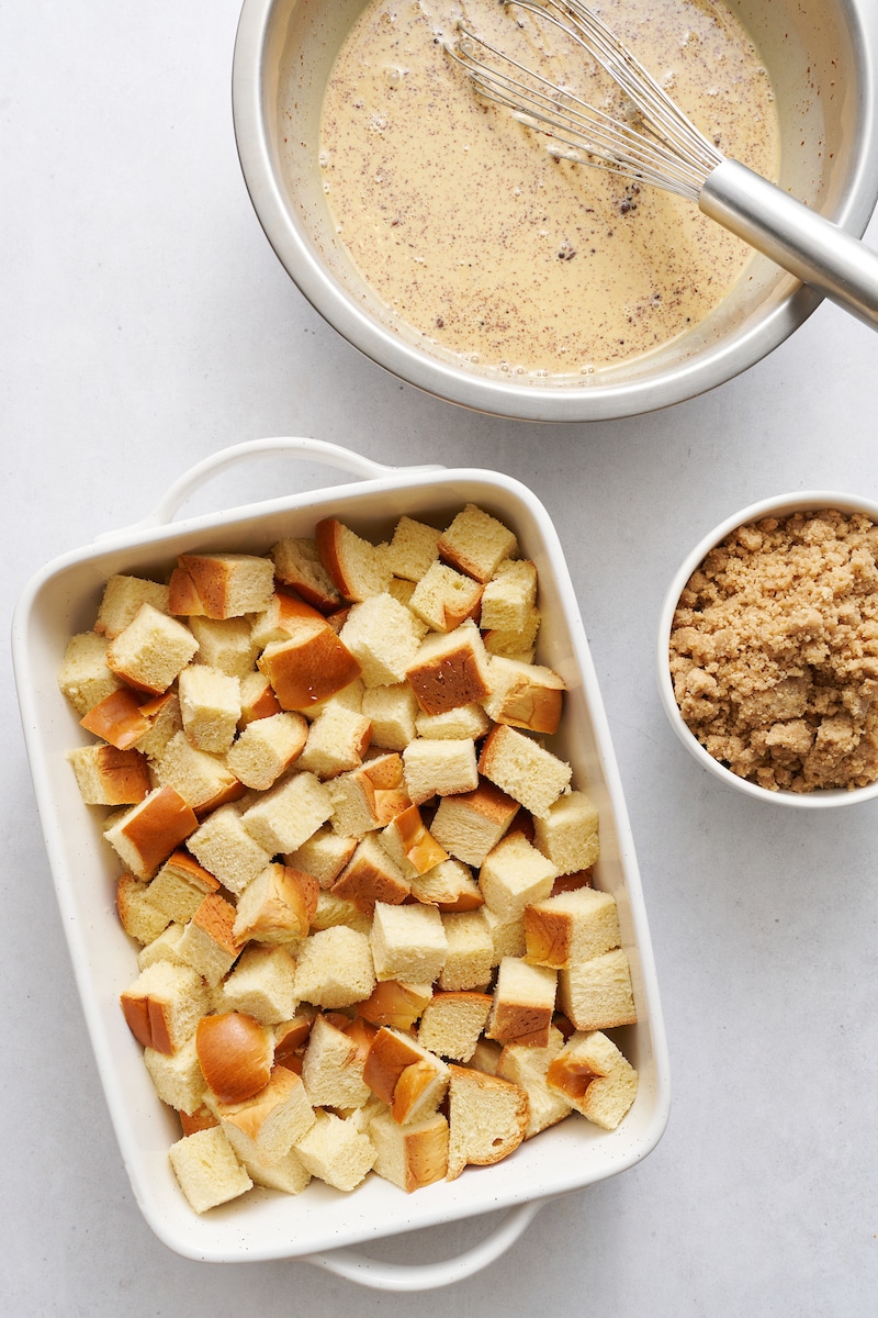 - Brown sugar: Flour, brown sugar, and butter make the most delicious crumb topping! But the brown sugar is also used in the French toast base to sweeten things up. In a pinch, dark brown sugar will work fine. But I don’t suggest using granulated sugar instead.