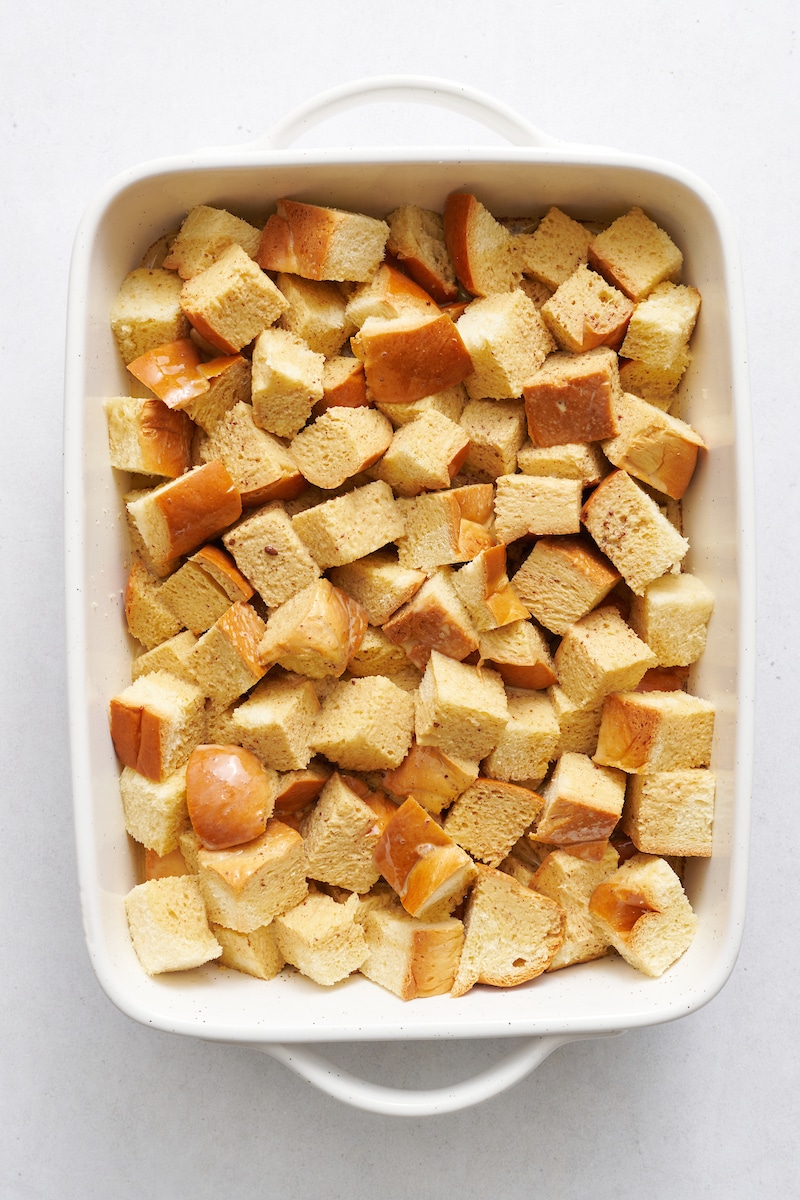 - Lightly grease a 9x13-inch baking dish with nonstick spray. Place the bread cubes into the prepared baking dish. Set aside.