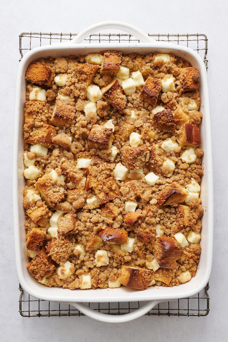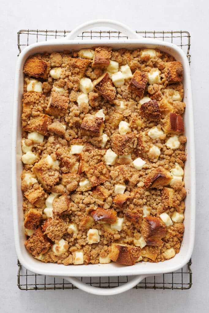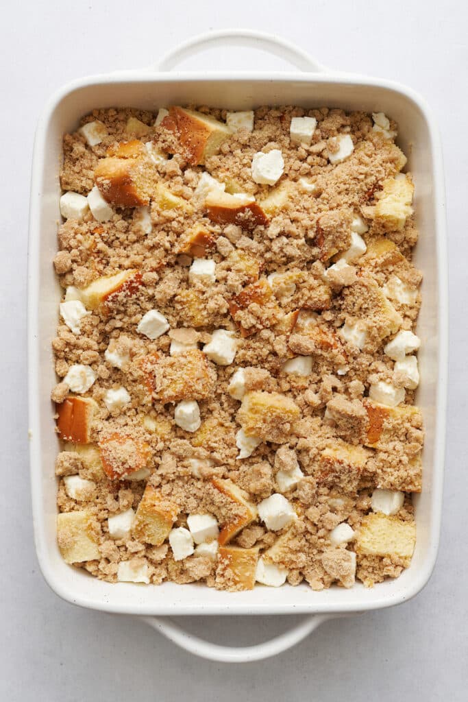 - Make the French Toast: Combine the bread cubes with the egg mixture. Top with cream cheese, then top with crumb topping.
