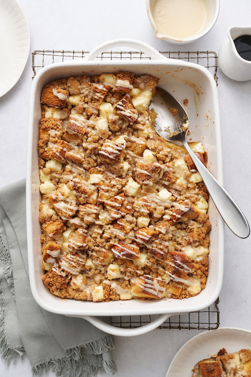 - Pour the liquid mixture over the bread. Then top with the cream cheese cubes, nestling them evenly across the top of the pan.