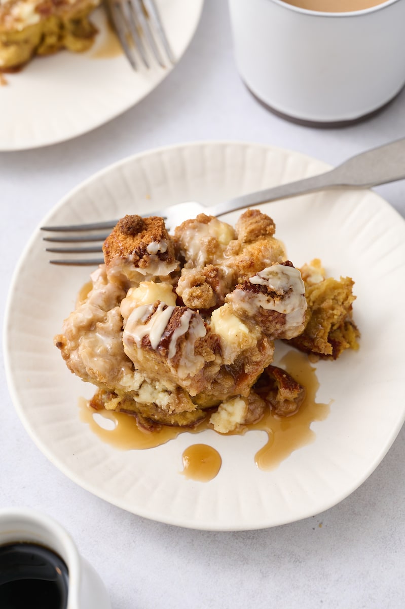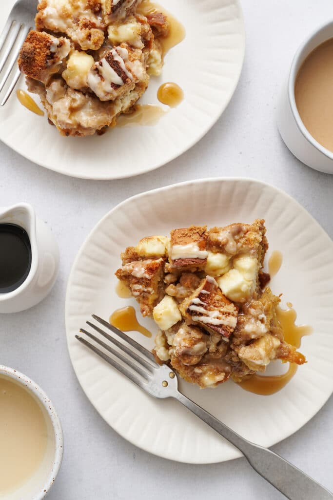 When you wake up, simply preheat the oven to 350, pull the casserole from the fridge, and pop it in the oven. Kick your feet up and enjoy a good book or the morning paper while it bakes! Or get started on a strong pot of coffee and warm up some maple syrup to enjoy with the French toast once it’s ready.