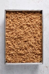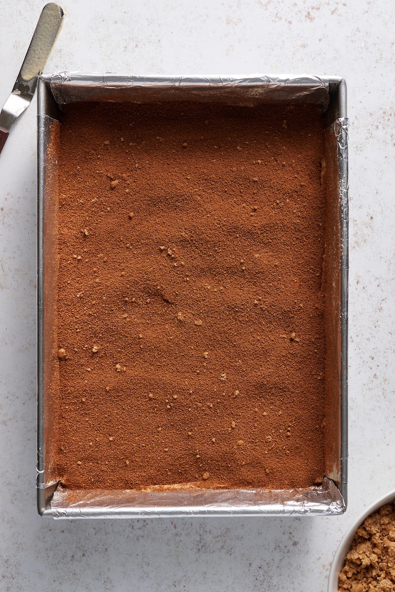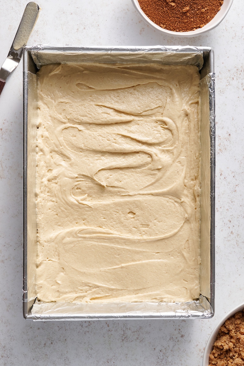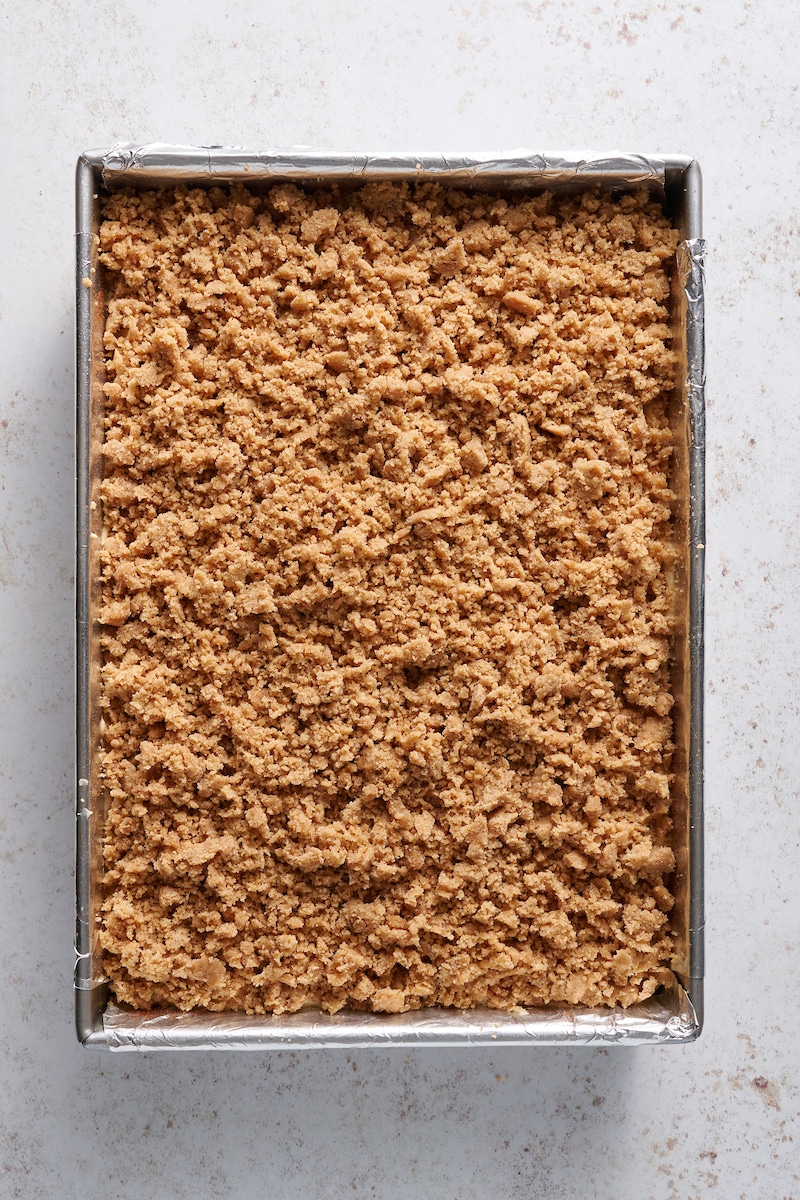 - Sprinkle the crumb topping evenly over the batter in the pan.