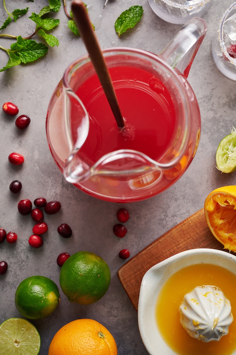 - In a large pitcher combine all of the simple syrup (above) with the tequila, orange liqueur, cranberry juice, fresh lime juice, and orange juice. Stir well.