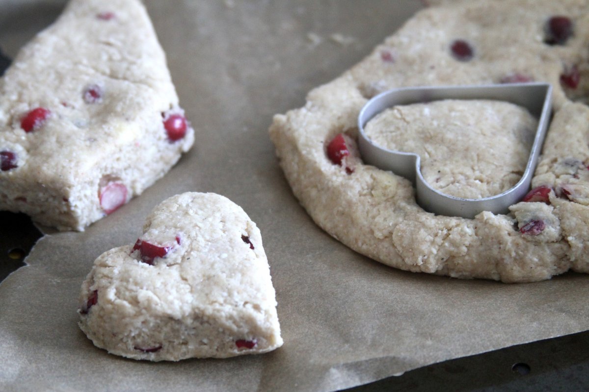 Turn the dough onto a well floured surface and gently knead the dough, just enough that it comes together. Press the dough down into a large square, about an inch thick. Then either cut into hearts, or using a sharp knife cut into triangles. Place on prepared baking sheet and bake for 15 to 20 minutes for larger scones, or 9-12 minutes for mini scones, the tops will be golden brown. Let cool on baking sheet for 5 minutes before eating, but I found these tasted best after a half hour of cooling.