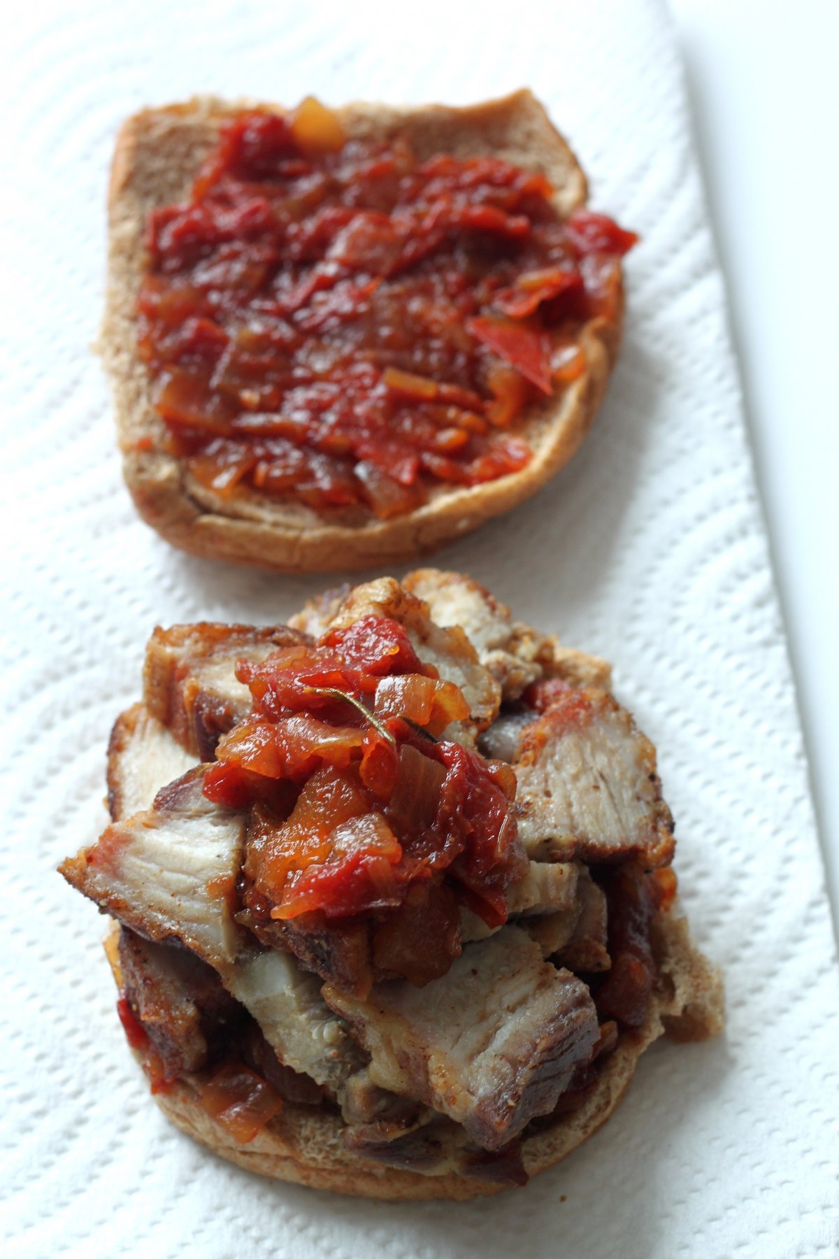 Once cooled, cut into little pieces, and serve on fresh buns with tomato jam.