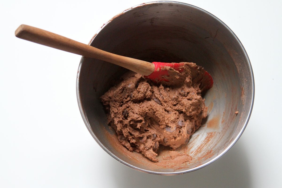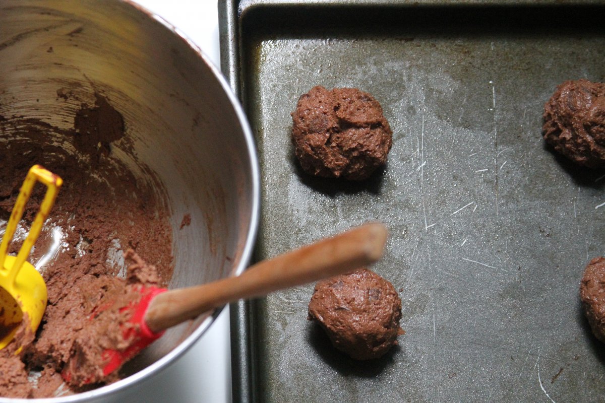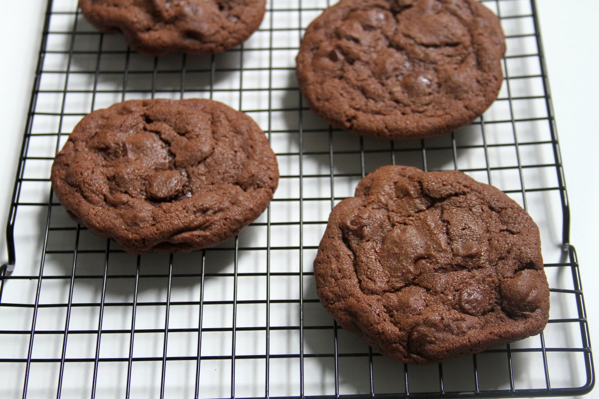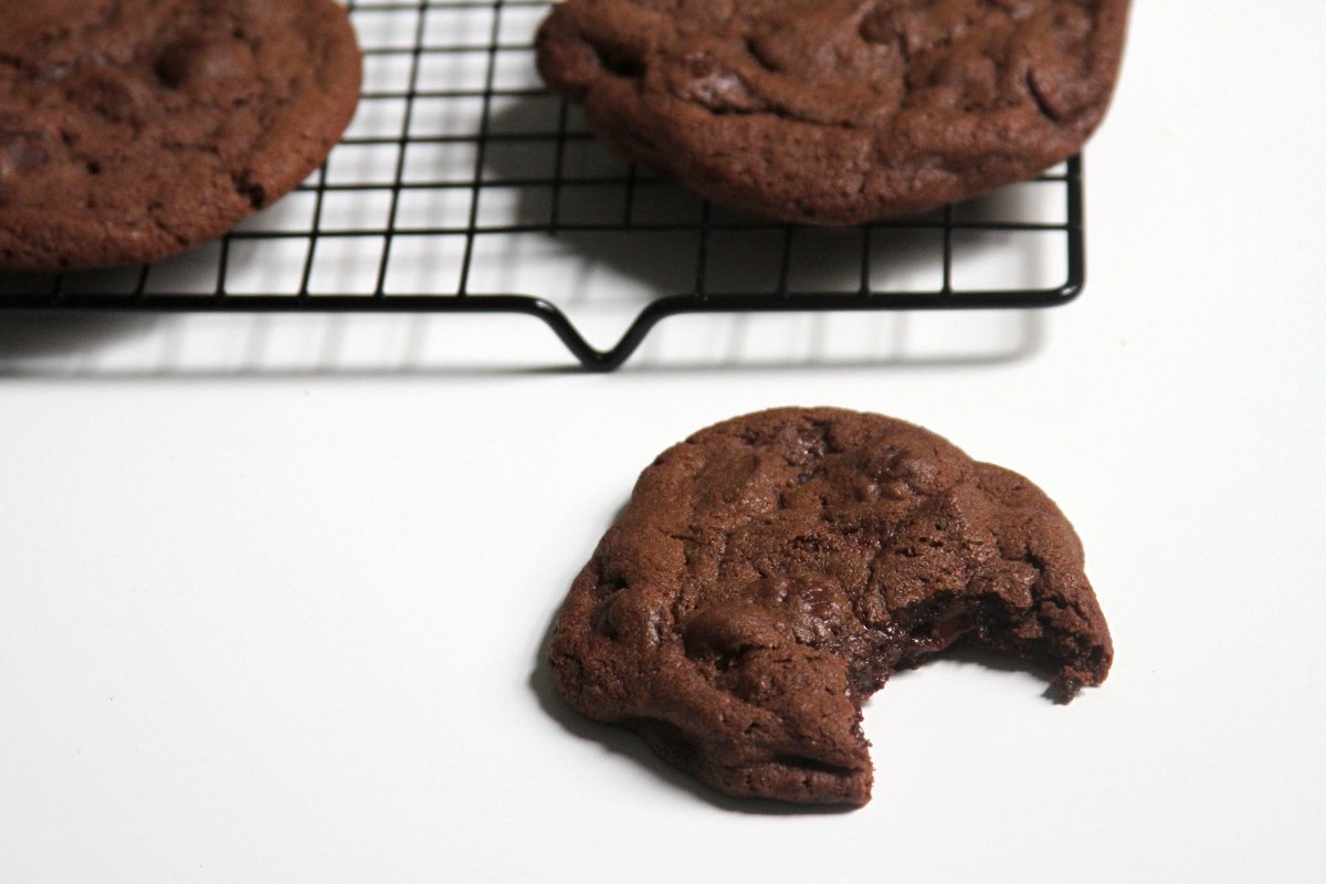 Preheat oven to 375 degrees (F). In a medium sized mixing bowl whisk together the flour, salt, and baking soda. In a large bowl stir together the cooled melted butter, both sugars, eggs, vanilla, and cocoa powder. Mix the flour combination into the butter combination, stirring until just combined. Fold in chocolate chips, stirring only until they’re evenly – or semi- evenly – distributed. Drop 3 tablespoon sized balls of dough onto prepared sheets, leaving about 2 inches between each cookie. Place pan in preheated oven and bake cookies for 9-12 minutes. Cool cookies for 5 minutes on baking sheet before transferring to a cooling wrack to cool completely.