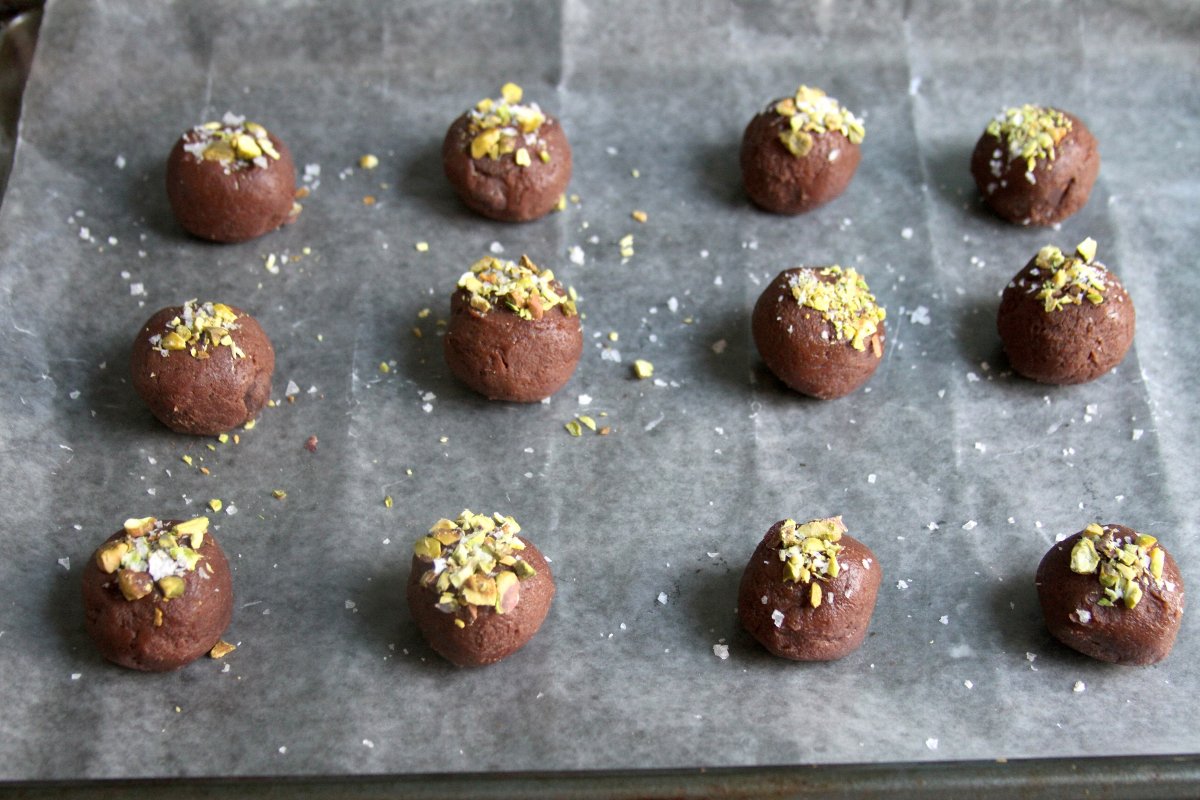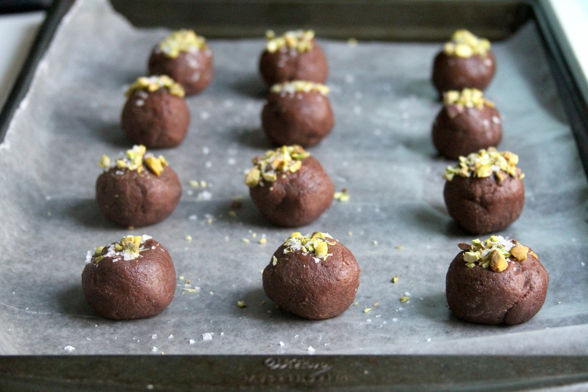 Roll balls of dough (measuring about 2 tablespoons each) into the chopped pistachios, place on prepared cookie sheets (leaving about 2 inches between each cookie), and sprinkle with sea salt. Bake for 10 minutes, then let cool for at least 10 minutes before removing from the tray to cool completely.