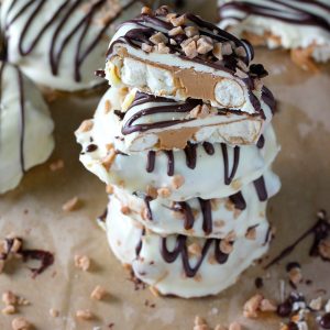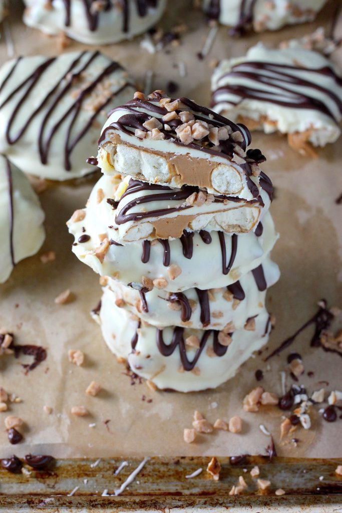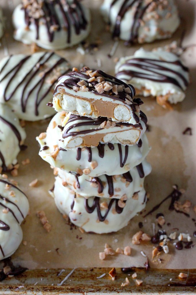 Hello friends! I made us more homemade treats! Giant crunchy pretzels stuffed with creamy peanut butter, dipped in white chocolate; drizzled in dark, and sprinkled with toffee >>> you gotta put these on your to-do list now! And when I say now, I mean like… right this instant! Just so we’re clear. These giant crunchy, creamy treats are too good to miss!
