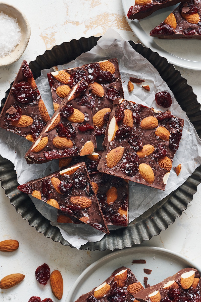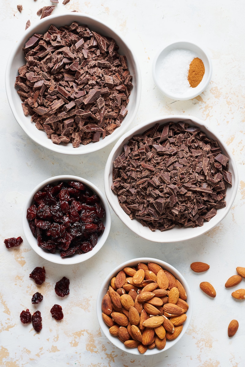 - Flaky Sea Salt: While the chocolate is still wet, sprinkle the top with a little flaky sea salt. This is optional but goes great with the dried cherries and nuts.