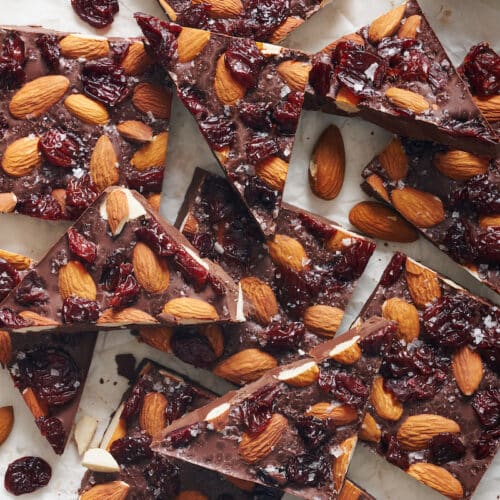 You can make chocolate bark with as few as 3 ingredients! And you can choose whether you want to make milk chocolate bark, white chocolate bark, or dark chocolate bark. But my personally favorite is a bittersweet chocolate bark loaded with crunchy nuts, dried fruit, and flaky sea salt.