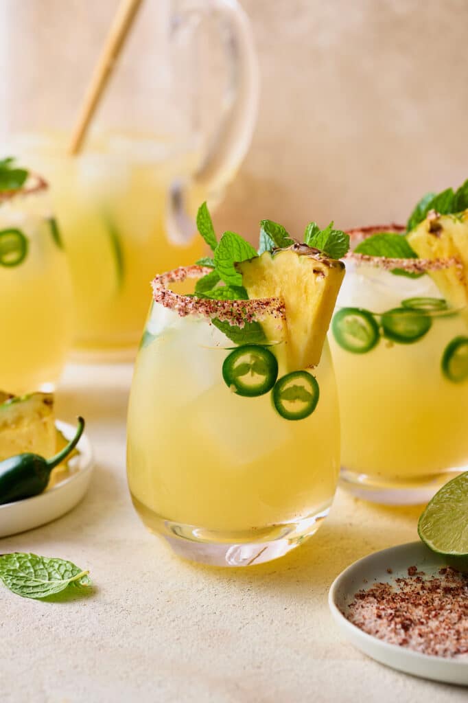 - Garnish the Margarita Glasses: This is totally optional, but so fun! And a guaranteed way to make your cocktails look like they came from a fancy bar. I like to add sliced jalapeños, pineapple wedges, sprigs of mint, and lime wedges. But feel free to add whatever you have on hand!