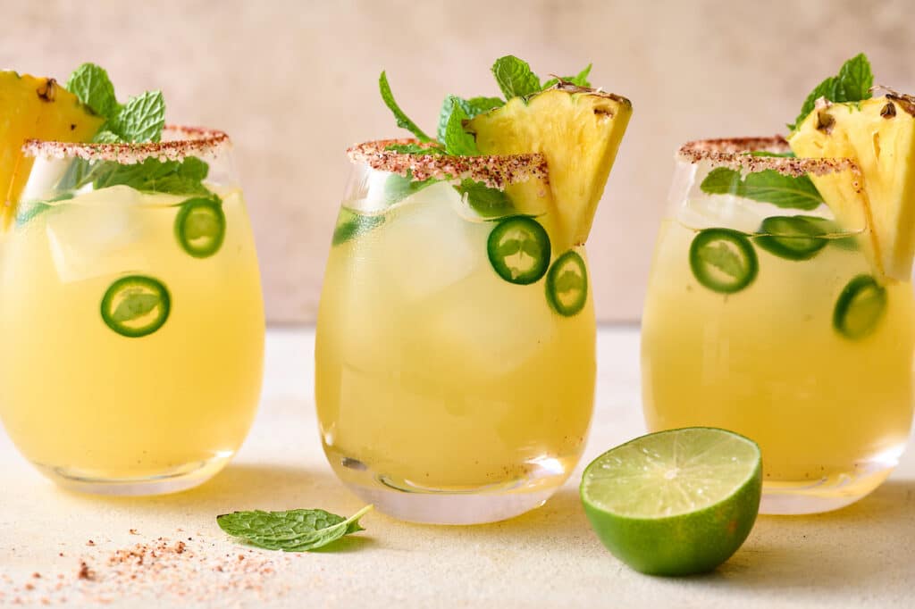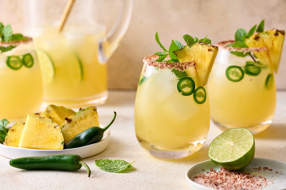 - Fill glasses with ice, then pour margarita mix on top. Garish with a pineapple wedge, a few jalapeño slices, and a sprig of mint and serve at once!