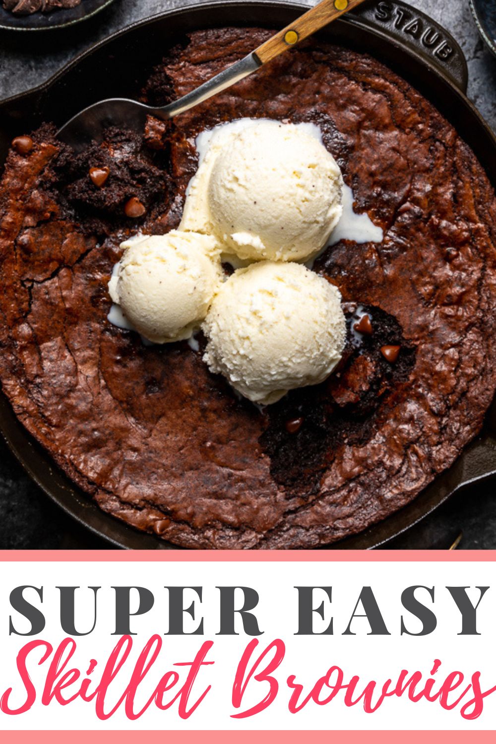 See, skillet brownies bake up in 30 minutes and are meant to be eaten right away! You don’t even need to slice them. Just plop a couple of scoops of vanilla ice cream on top, grab a spoon, and dig in!