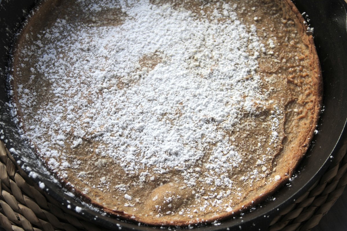 Melt the butter in a 9 inch skillet, being sure to coat the pan evenly with the melted butter, sides of pan included. Pour the batter into the skillet and transfer the skillet into the preheated oven. Bake for about 15 minutes, or until the pancake is golden and puffy. Remove from the oven and sprinkle with powdered sugar. Enjoy immediately.