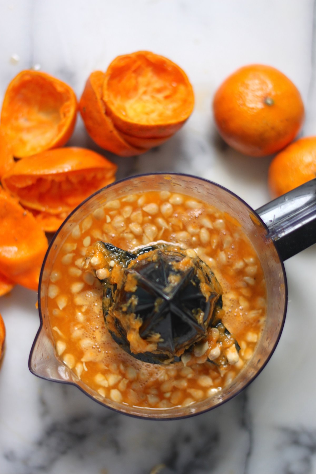 Tangerines are very available right now, and you shouldn’t have a problem finding a giant box for 7 or 8 dollars, even less if you’re lucky and find them on sale. And because tangerines are naturally very juicy, juicing them if pretty easy. I started out using my citrus juicer, but by the end just went with squeezing the juice out manually and straining out the seeds at the end.
