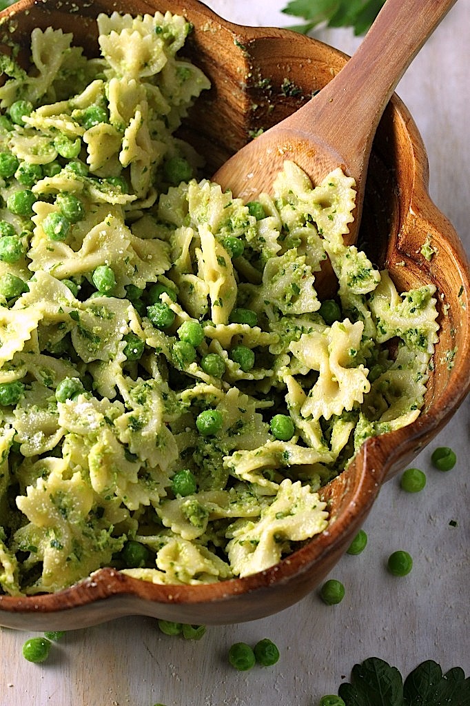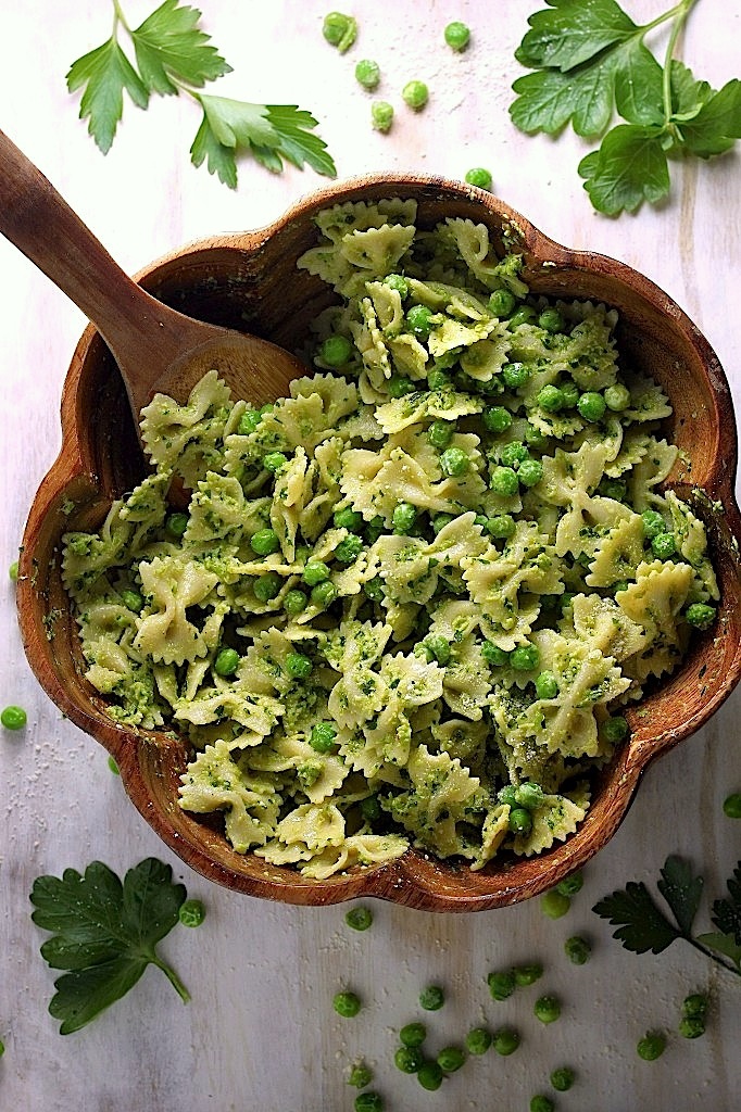 - Cook 1 cup peas according to package instructions. In a food processor, combine cooked peas, parsley, walnuts, Parmesan, garlic, and 1 tablespoon water. Pulse until a paste forms. With machine running, slowly add oil, processing until blended; season with salt and pepper.