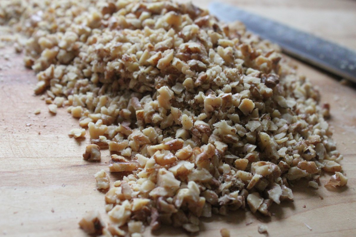 - Spread the walnut halves on a large rimmed baking sheet and toast in the oven for about 9 minutes, until they are golden and fragrant. Let cool slightly, then transfer the walnut halves to a work surface and finely chop them.
